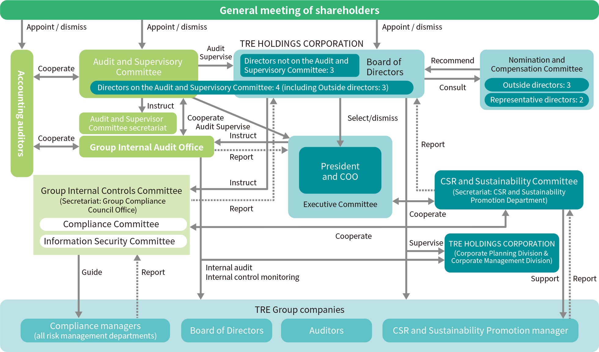 The TRE Group is aware that its businesses are built on the healthy relationships of trust it has developed with shareholders, employees, business partners, the residents of the areas around its business locations and various other stakeholders. Based on that mindset, we have positioned the strengthening and enhancement of corporate governance as a key management task in order to pursue sound management and live up to the trust that society has in us.