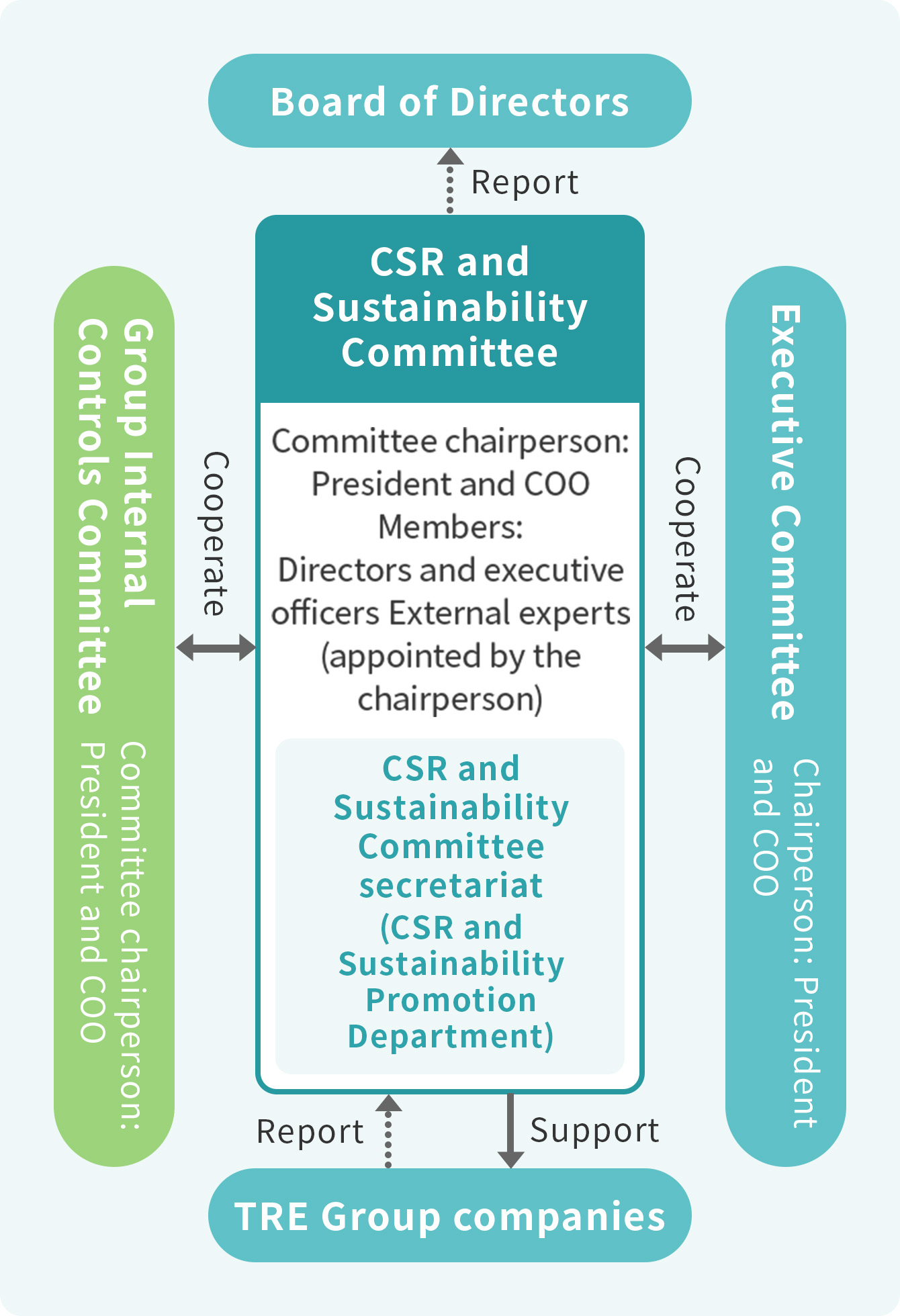 The TRE Group regards the impact of climate change on our business as an important management issue. Accordingly, in our Medium-Term Business Plan we have set the goal of realizing an efficient recycling society and a carbon-neutral society, and are working to tackle a range of related challenges. Recognizing that climate change presents both mid- to long-term risks and opportunities for the Group's business, in addition to studying countermeasures we have endorsed the TCFD recommendations and joined the TCFD Consortium in order to ensure appropriate disclosure of information to our stakeholders.